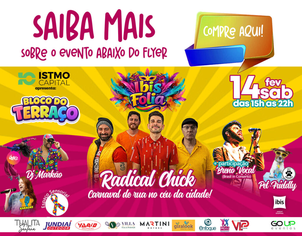 A festa de carnaval que foi sucesso em 2024 volta para a programação do Carnaval de Jundiaí/SP no rooftop do hotel Ibis Jundiai Shopping. Com vista privilegiada na área mais nobre da cidade, o BLOCO DO TERRAÇO traz a alegria do carnaval de rua para um ambiente seguro e divertido. Confira as atrações: