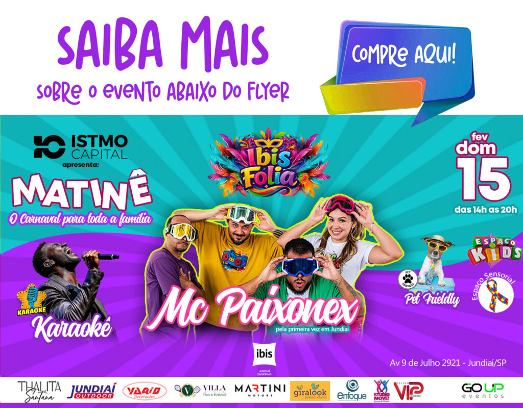 A festa de carnaval que foi sucesso em 2024 volta para a programação do Carnaval de Jundiaí/SP no rooftop do hotel Ibis Jundiai Shopping. Com vista privilegiada na área mais nobre da cidade, a MATINÊ é um evento com atrações para as crianças e para toda a família, A festa conta com um super show para a criançada, além de brinquedos infláveis e cama elástica. Mas os pais podem ficar tranquilos, pois teremos um ambiente com muito carnaval e drinks deliciosos enquanto os pequenos se divertem. Confira as atrações: